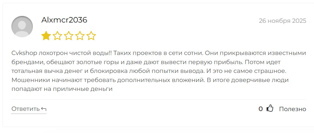 О компании Cvk shop отзывы встречаются только отрицательные. Люди жалуются на классическую схему мошенничества. Развод заключается в том, что для последующего вывода заработанных средств пользователям требуется покупать новые уровни аккаунтов, делать более крупные аккаунты. Все это требует дополнительного ввода средств на свой счет. Вместо заработка люди сталкиваются с крупными тратами. Также отзывы о Cvkshop cc предупреждают, что подобных проектов сотни и не рекомендуют вестись на этот скам.