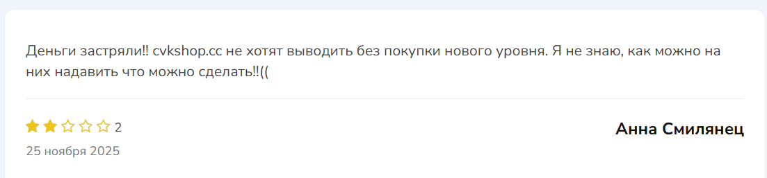 - о заработке с Cvkshop отзывы очень негативные, так как пользователи не смогли вывести деньги и потеряли все вложенные.