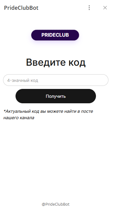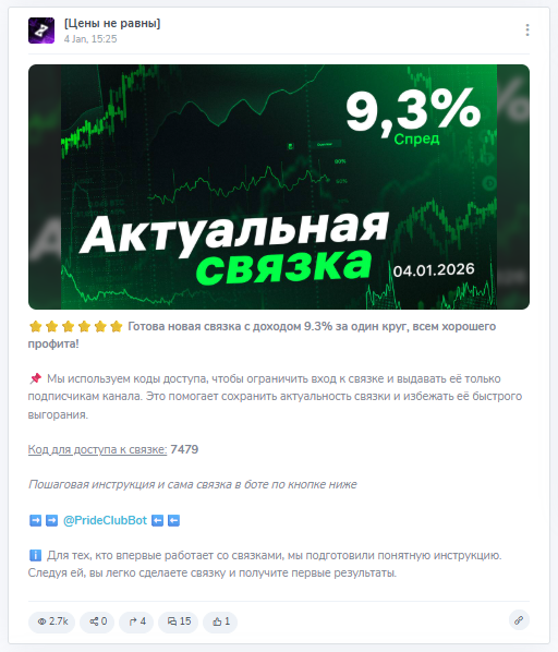 Автор предоставляет подписчикам связки через бот @PrideClubBot, который открыт для публичного доступа. Чтобы открыть статью с описанием актуальных торговых операций понадобится ввести специальный код, который публикуют только в постах из ленты основного телеграмм-канала.