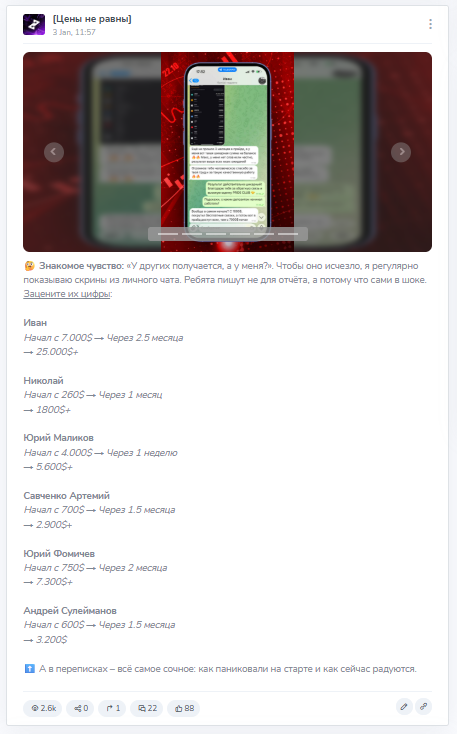 «Цены не равны» – это телеграмм-канал по теме арбитража криптовалюты, поэтому его автор делится с подписчиками торговыми связками. Он заявляет, что готов помочь людям начать зарабатывать, бесплатно рассказывая о своей торговле и результатах.