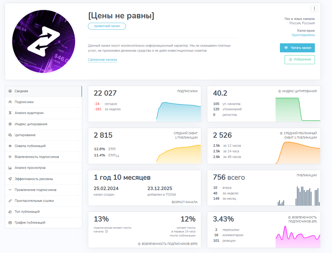 Канал является приватным, поэтому его не найти через стандартный поиск, а пользователю потребуется пригласительная ссылка, которую сложно отыскать на просторах сети. Проанализировав статистику, мы обнаружили некоторые признаки накрутки, так как данные по ресурсу есть за период с конца декабря 2025 года.