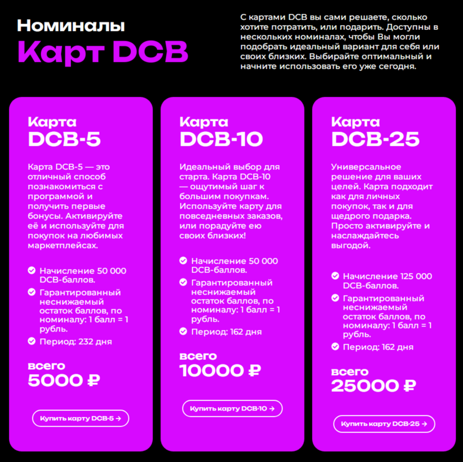 - DCB-25 – начисляется 125 000 баллов на 162 дня и стоит 25 000 рублей;