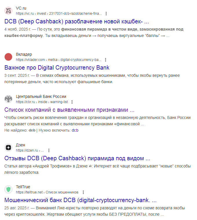 «Dcb пирамида лохотрон» — самый популярный запрос в интернете о данной организации. Она позиционируется как цифровая программа лояльности, которая позволяет накапливать баллы и тратить их на маркетплейсах. Успешной репутацией компания не обладает.