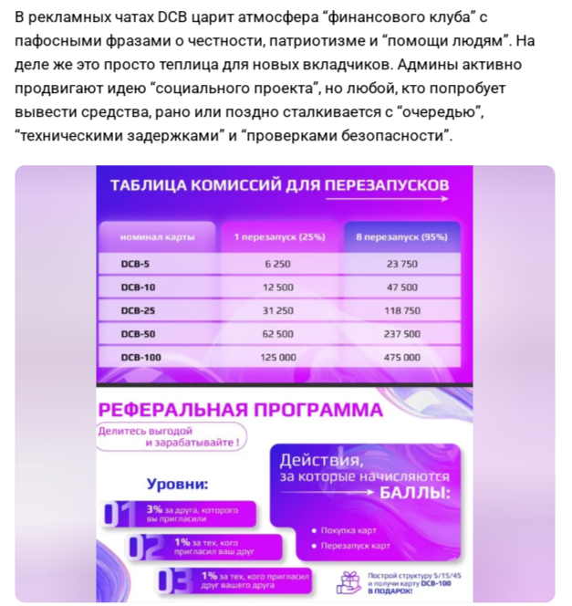 В одном разобчлении указывалось, что ресурс DCB является лохотроном, действует как финансовая пирамида и осуществляет обман на сертификатах. Участникам реферальной программы обещают процентное начисление по трем уровням: 3% – за приглашенного друга; 2% – за тех, кого пригласил друг; 1% – за тех, кого пригласил друг первого друга.