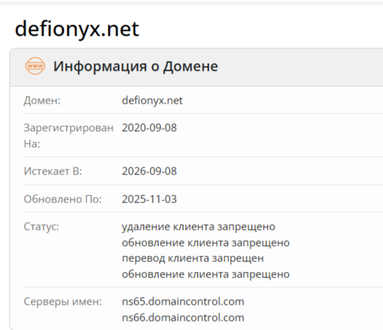 Внимательная проверка сервиса по обмену крипты позволила нам получить следующие результаты. Домен defionyx net был зарегистрирован 08 сентября 2020 года. Обменным пунктом данный портал стал 03 ноября 2025 года после обновления ПО. На сайте обменника нет данных о юридическом статусе компании, лицензии, гарантиях для клиентов. Молодой возраст и отсутствие подтверждений надежности обменного пункта намекают на некое мошенничество и развод со стороны владельцев.