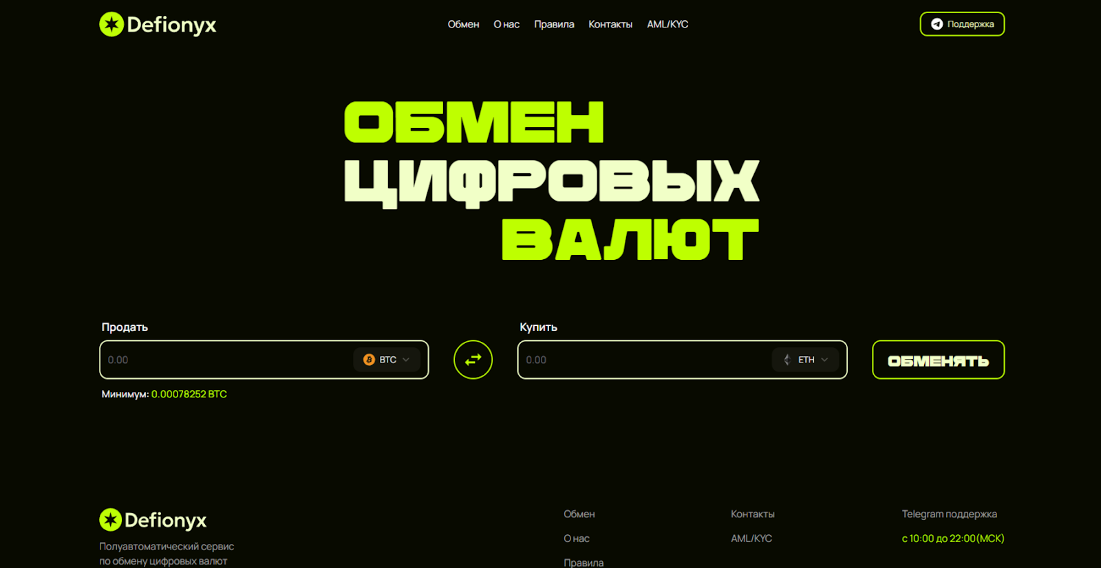 Криптовалютный обменник Defionyx работает ежедневно c 10-00 до 22-00 по МСК. Этого же режима придерживается служба поддержки сервиса. Связаться с саппортом клиенты могут посредством внутреннего чата, имейла valerauakovlev gmail com или телеграм-канала defionyx support. Последний способ связи на момент обзора недоступен.
