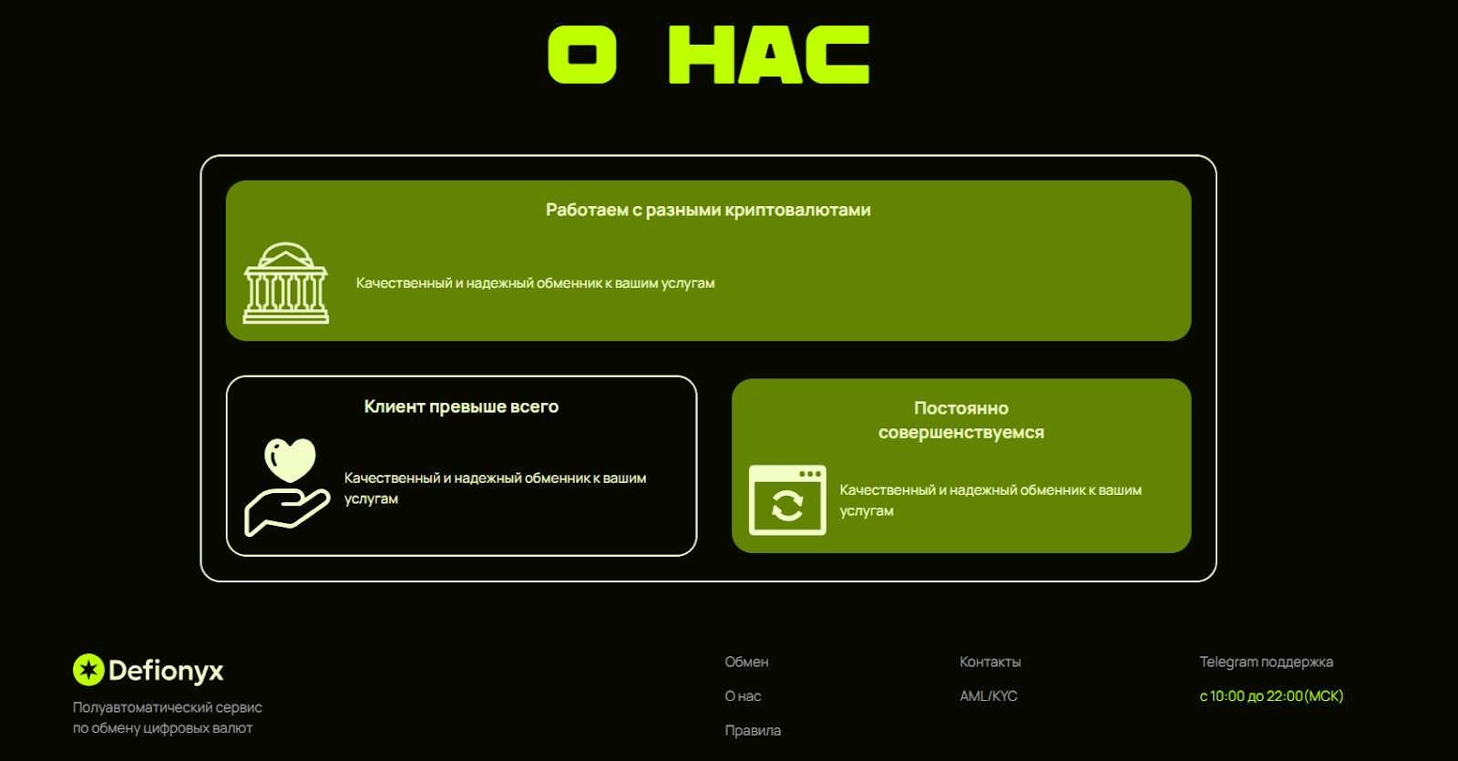 Веб-сайт обменного пункта представляет собой классический шаблон. С первого взгляда видно, что сервис за 100 условных рублей делали непрофессионалы без фантазии. В хедере портала представлены вкладки «Обмен», «О нас», «Правила», «Контакты», AML/KYC. Раздел о нас знакомит посетителей с качественным и надежным обменником, для которого очень важны клиенты.
