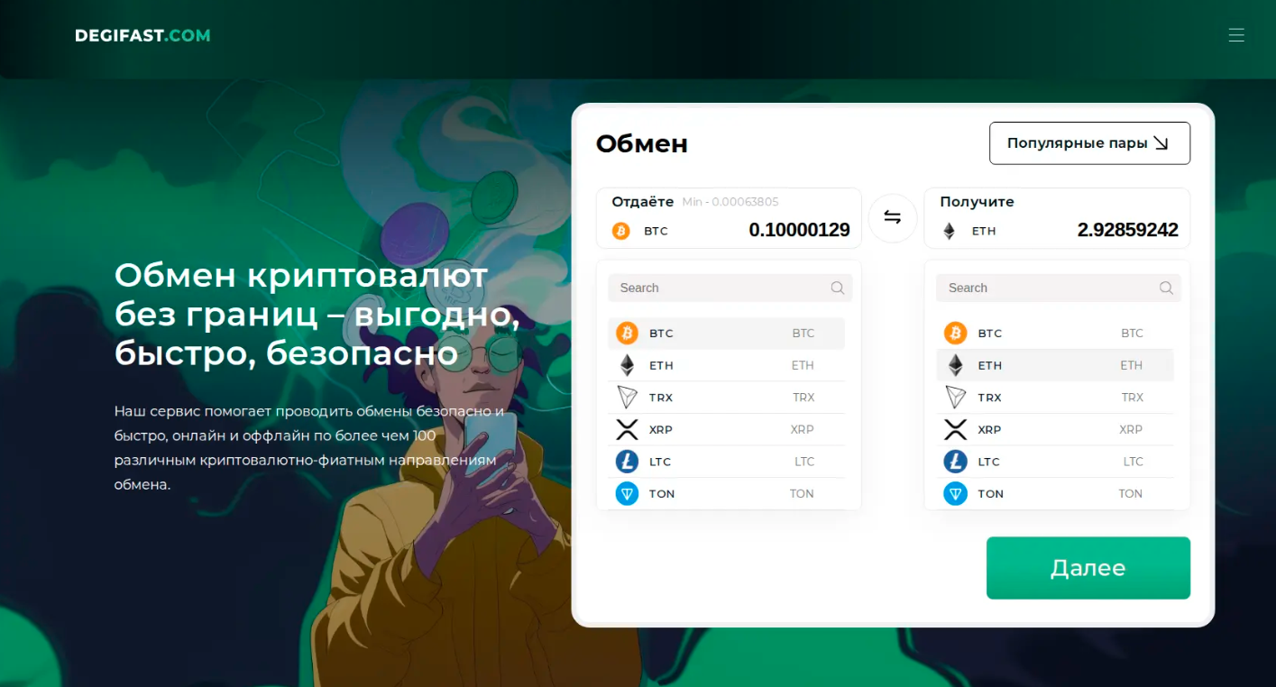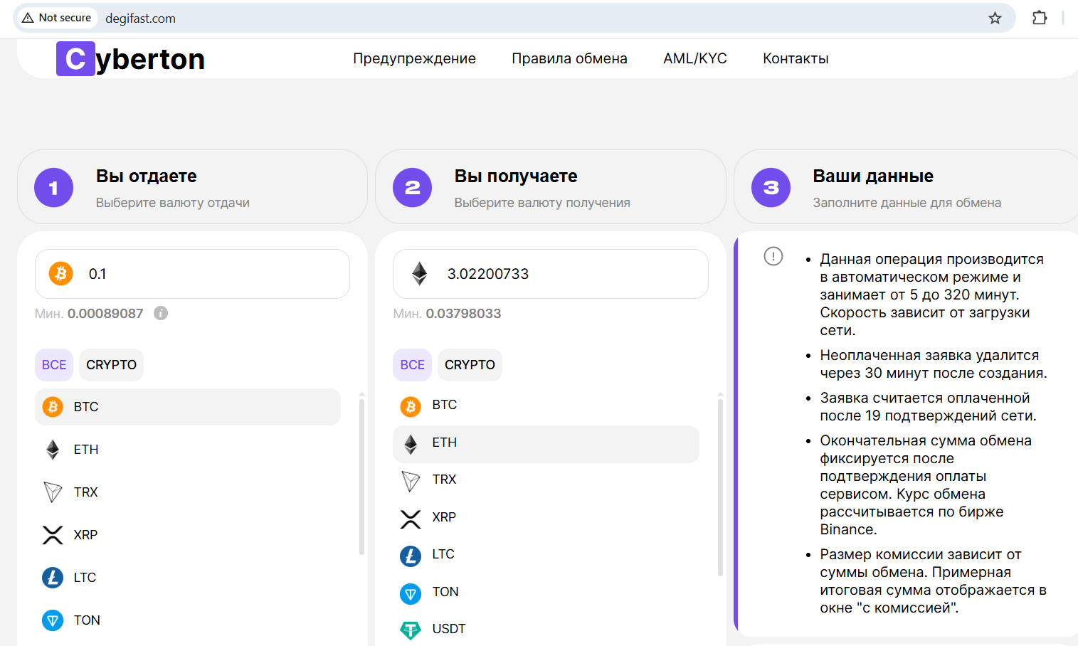 Обменник Degifast — это онлайн-сервис обмена криптовалют, который на сайте и в интерфейсе продвигается под брендом Cyberton и предлагает автоматические крипто-обмены без регистрации.