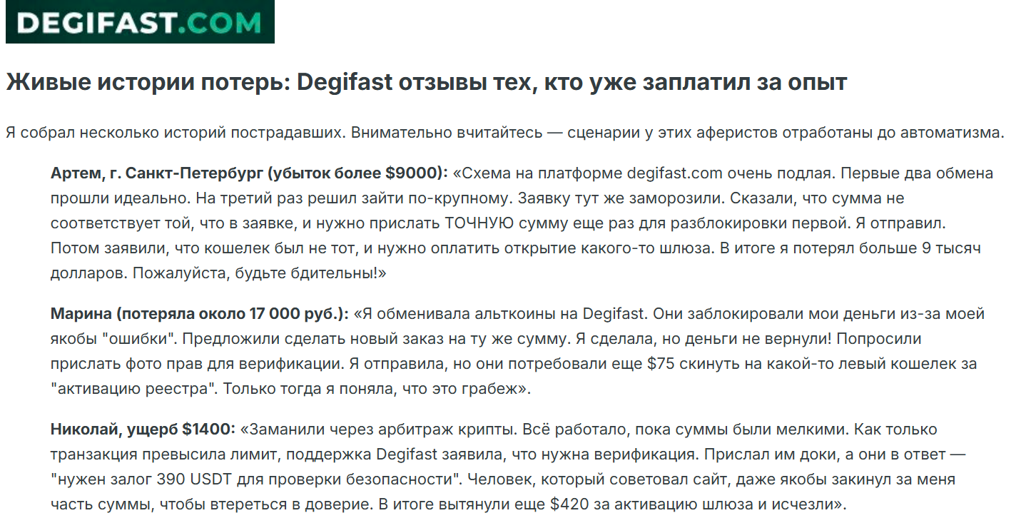 Люди описывают потерю от 1400 долларов до более чем 9К долларов, ситуации, когда после первой успешной операции сервис перестает выполнять обмен, требует новые переводы и затягивает процесс под видом AML-проверок.