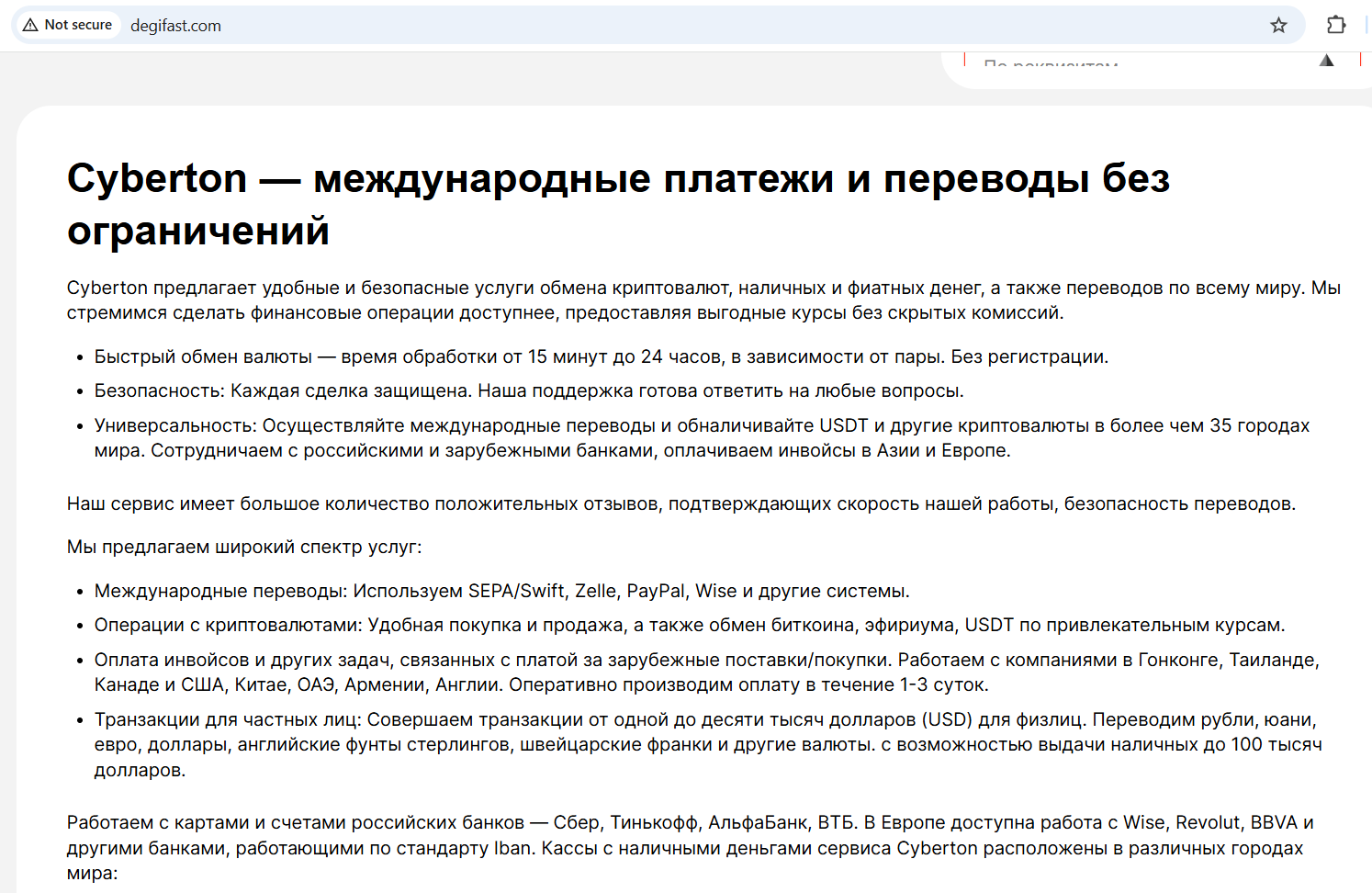 Сайт работает на домене degifast com, а бренд, логотип и тексты — Cyberton. Никакого объяснения, почему обменник Cyberton размещен именно на этом домене, на сайте нет.