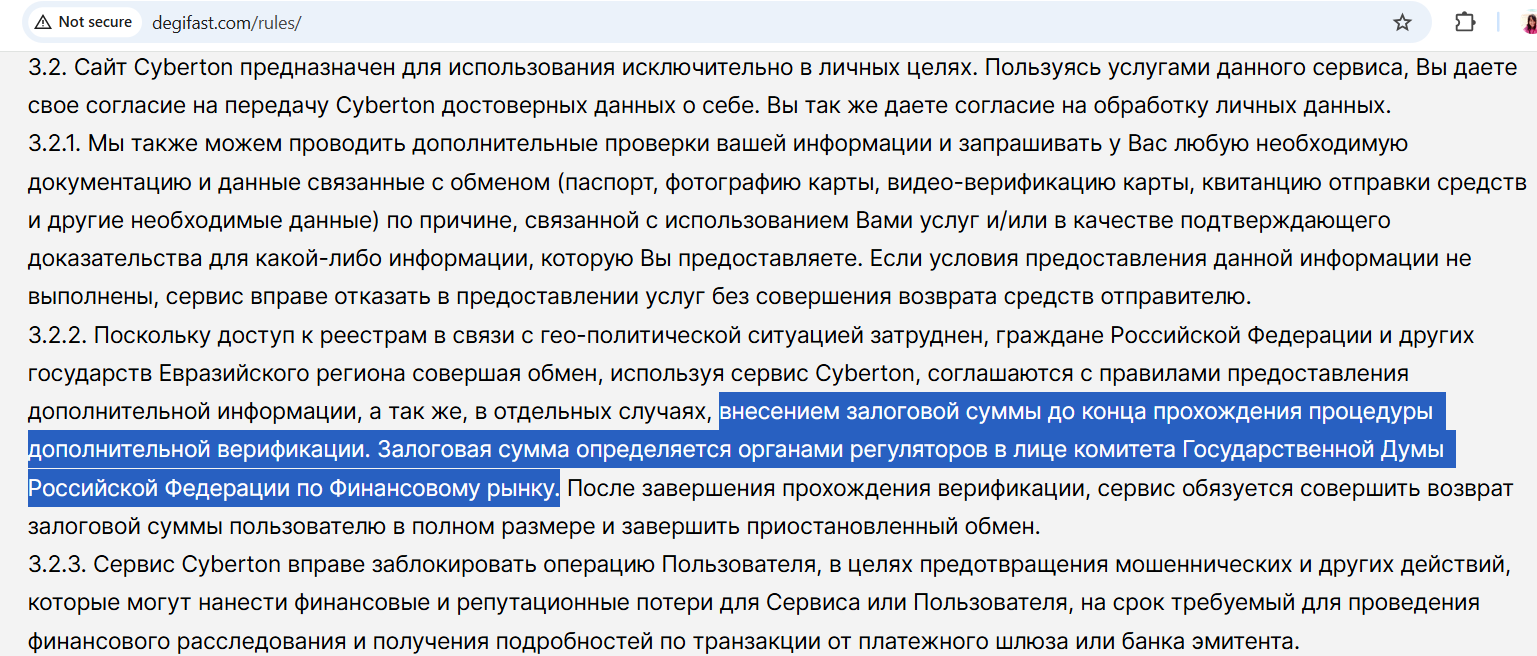Во многих пунктах указано, что в случае отказа предоставить информацию сервис вправе отказать в услуге без возврата средств. В ряде формулировок встречаются абстрактные органы регуляторов и даже упоминания Госдумы РФ.Государственная Дума не устанавливает залоговые суммы, не участвует в AML-проверках частных обменников, не определяет депозиты для верификации и не “назначает” залоги пользователям крипто-сервисов.