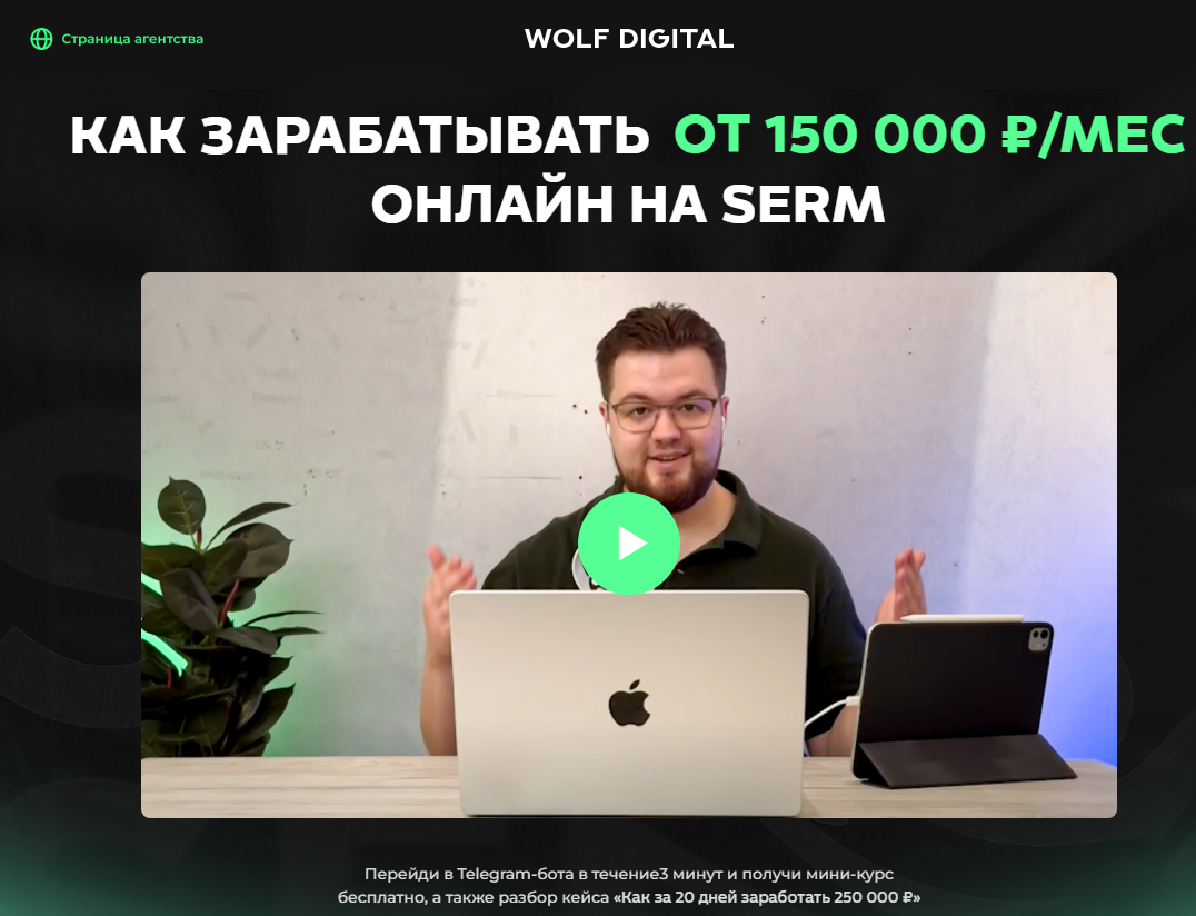 Платформа основателя online академии находится в сети по адресу Wolf Digital. Опытный коуч объясняет пользователям как без труда можно зарабатывать от 150 000 рублей в месяц. Куратор школы продвигает заработок на использовании особенностей «СЕРМ». На главной странице площадки закреплено объявление о том, что мини-курс можно получить бесплатно, если перейти по ссылке в телеграм-бот.