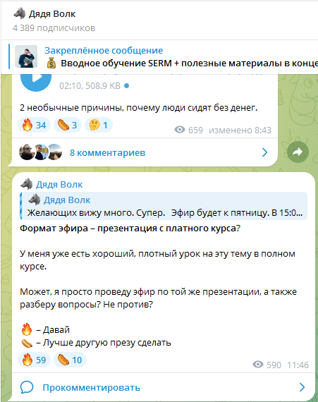 В телеграм-канале Денис выкладывает посты, мотивирующие фолловеров начать обучение, а также объявляет даты видео эфиров.