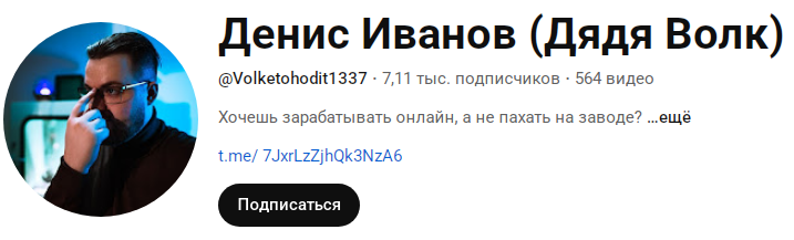 На паблик в Телеграме, принадлежащий Денису, подписано 4 389 юзеров. В профиле закреплена ссылка на рабочий аккаунт Иванова в ТГ, а также ссылка на «Ютьюб» комьюнити.