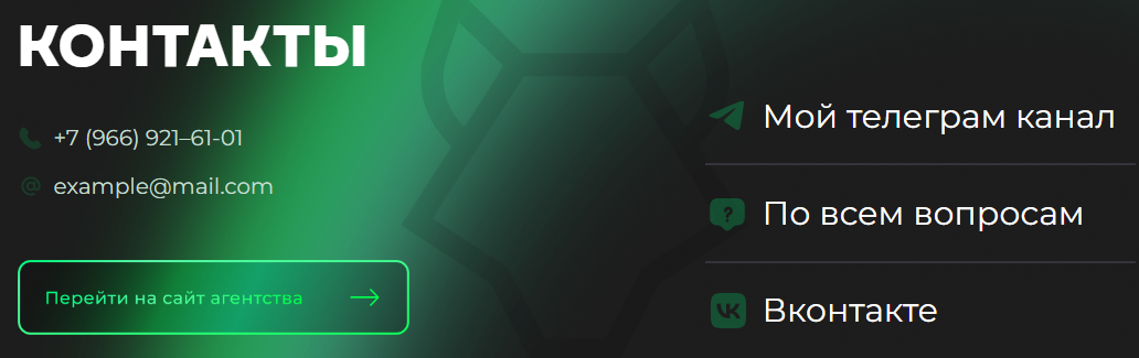 На площадке в интернете опубликован телефон «волка», ссылки на сообщества в ВК и Telegram, а также зачем-то пустой адрес почты. Судя по всему, конструктор сайта не дал возможность «дяде» совсем убрать поле с указанием электронной почты, и опытный маркетинговый эксперт решил оставить все прям так, как есть.