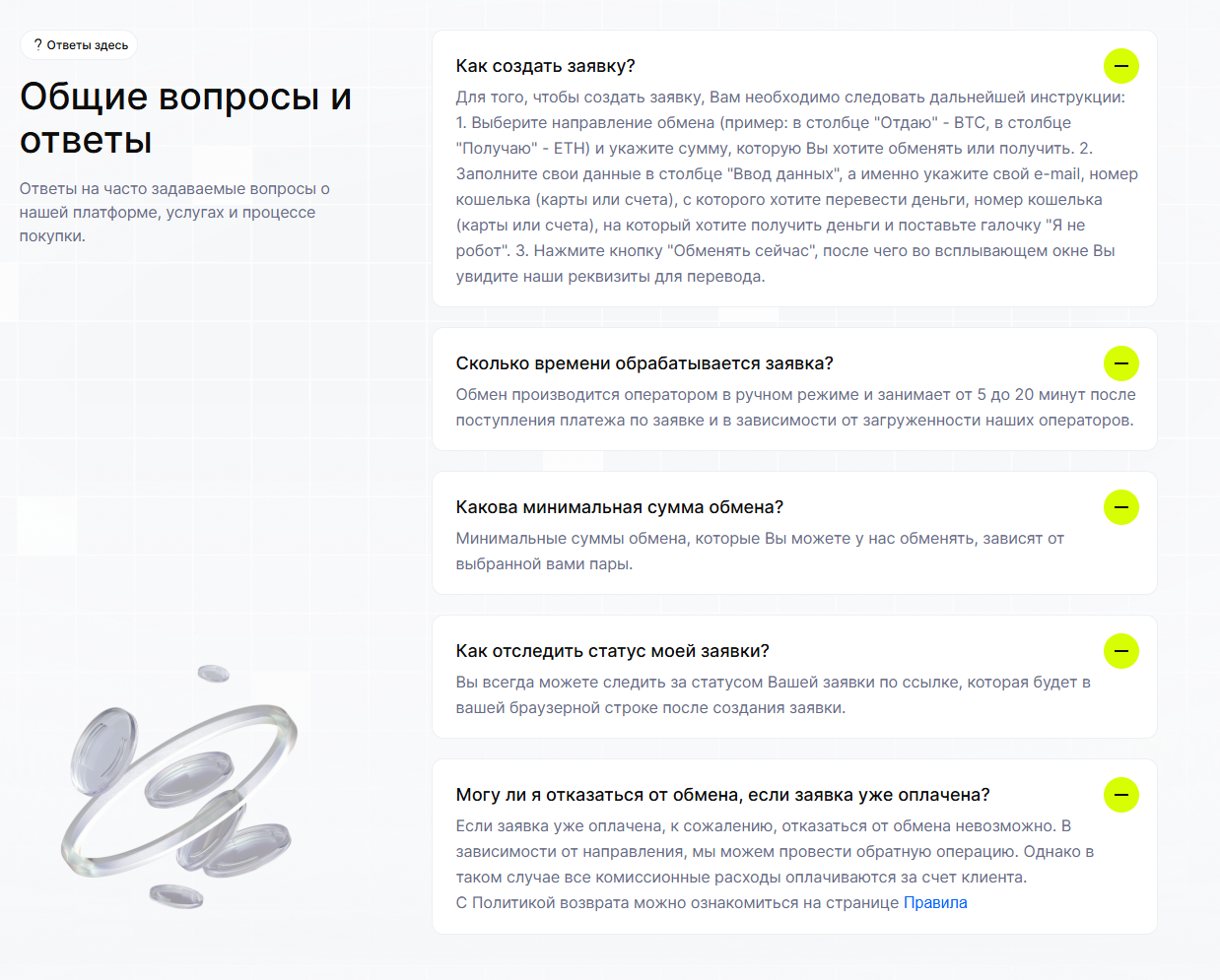 Создание заявки происходит непосредственно на главной странице. Пользователь выбирает направление, вводит сумму, получает реквизиты для перевода и отправляет криптовалюту. Далее ожидается ручная обработка и зачисление на указанный кошелек.Самовольные переводы на реквизиты без создания заявки запрещены и приводят к аннулированию операции с возможной потерей средств. Также регламент содержит строгие условия по точности суммы и сети перевода. При несоответствии требуется дополнительная транзакция для коррекции.