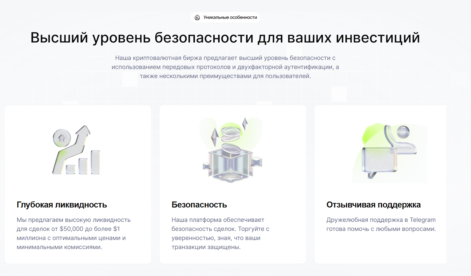 Среди дополнительных особенностей заявлена повышенная безопасность транзакций за счет использования передовых протоколов шифрования и двухфакторной аутентификации. Но детали реализации не раскрываются. Действует промо-акция под названием «Отзыв = Деньги», в рамках которой за каждый отзыв о платформе пользователь получает вознаграждение в размере двух USDT.