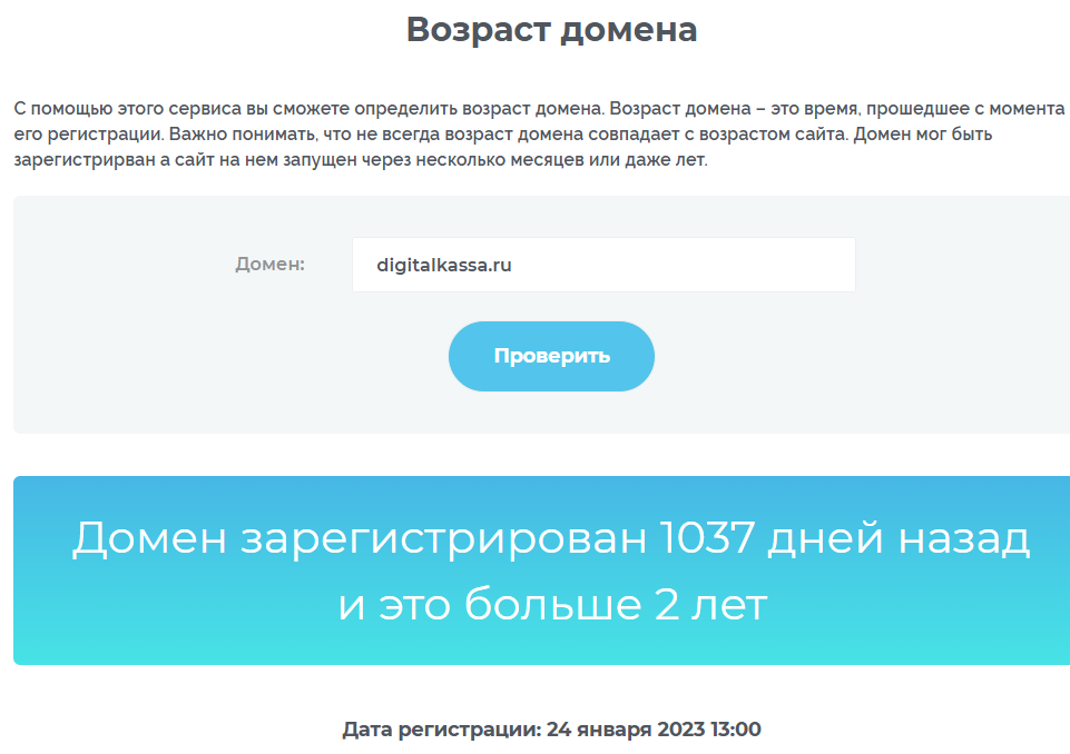 Подтверждает это и проверка возраста домена. Сайт Digitalkassa ru появился 24 января 2023 года. Представители онлайн-кассы не завысили срок работы своего проекта, что характеризует их с хорошей стороны.