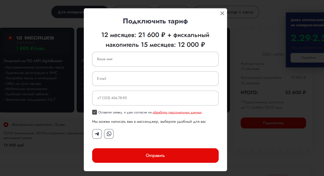 DigitalKassa предлагает облачные кассы для интернет-магазинов, служб доставки, сервисов бронирования, вендинг-автоматов и т.п. Есть кассы для одного чека. Если сложно определиться с вариантом, стоит кликнуть на кнопку “Получить помощь”. В форме указать имя, электронную почту и номер телефона. Спустя время специалист выйдет на связь и подберет подходящий вид кассы.