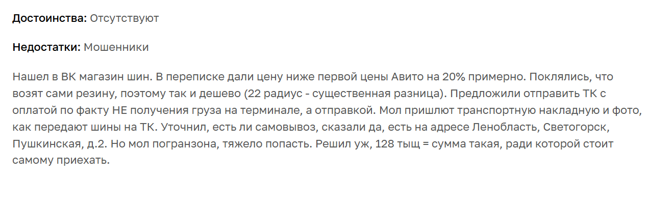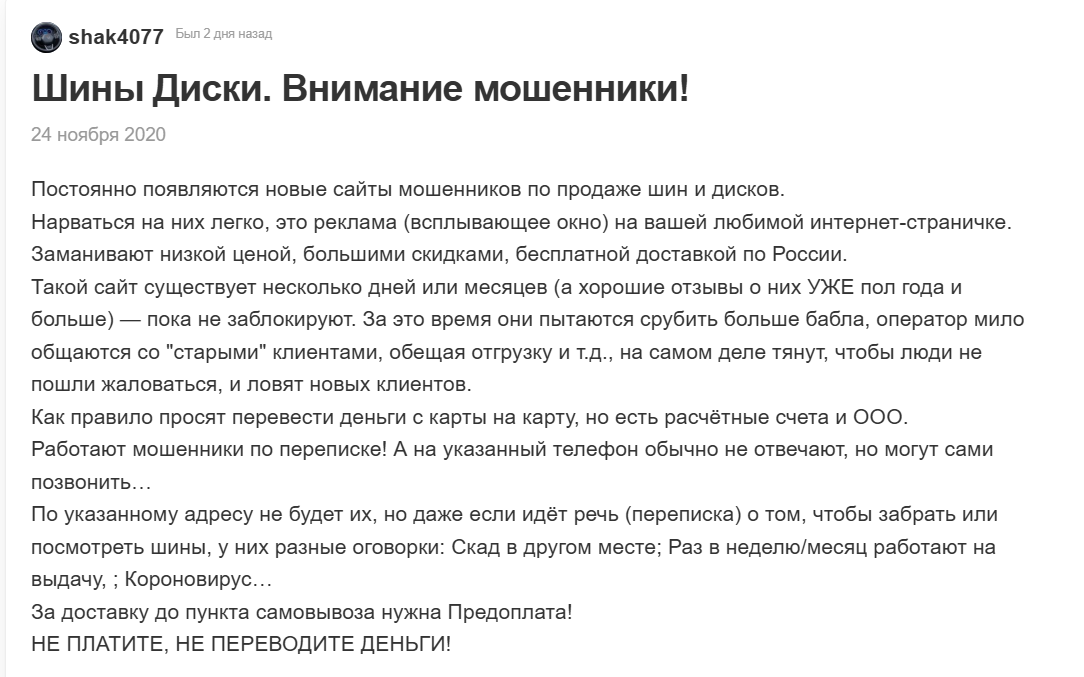 При этом в сети много откликов о похожих телеграмм магазинах шин и дисков, где люди описывают одно и то же. Завлекают низкой ценой, быстро переводят в личку менеджера, предлагают доставку через СДЭК/ТК, затем уводят оплату на сомнительную страницу или просят предоплату, а дальше либо тянут время, либо блокируют.