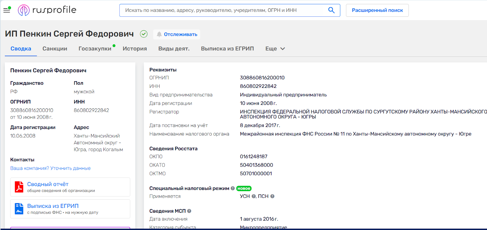 По данным из Rusprofile: ИП Пенкин Сергей Федорович, регистрация 10.06.2008 г. Это существующий предприниматель с историей, но основной ОКВЭД у ИП это “Ремонт компьютеров и коммуникационного оборудования”.