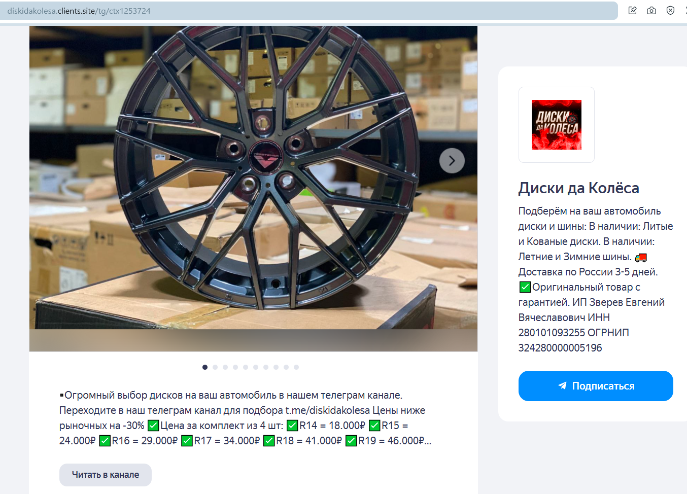 Телеграмм канал “Диски да Колеса” — проект в виде паблика, о котором мало отзывов, но в контенте много однотипных карточек с дисками и обещаний быстрой доставки по России с призывами написать в “подбор” и оформить заказ.