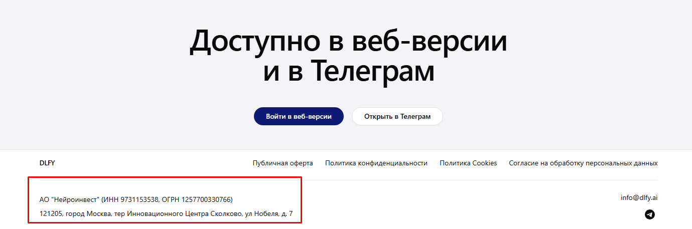 Проектом управляет российская компания АО «Нейроинвест», зарегистрированная в Сколково. Размер уставного капитала всего 50 тыс. руб. В должности директора указан Володин Юрий Анатольевич. На сайте опубликованы реквизиты и электронный адрес техподдержки info @ dlfy ai.