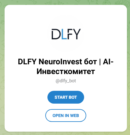 У проекта есть телеграм-бот @ Dlfy Bot, он называется «DLFY NeuroInvest Бот AI Инвесткомитет». Сервис выполняет те же функции, что веб-версия инструмента.