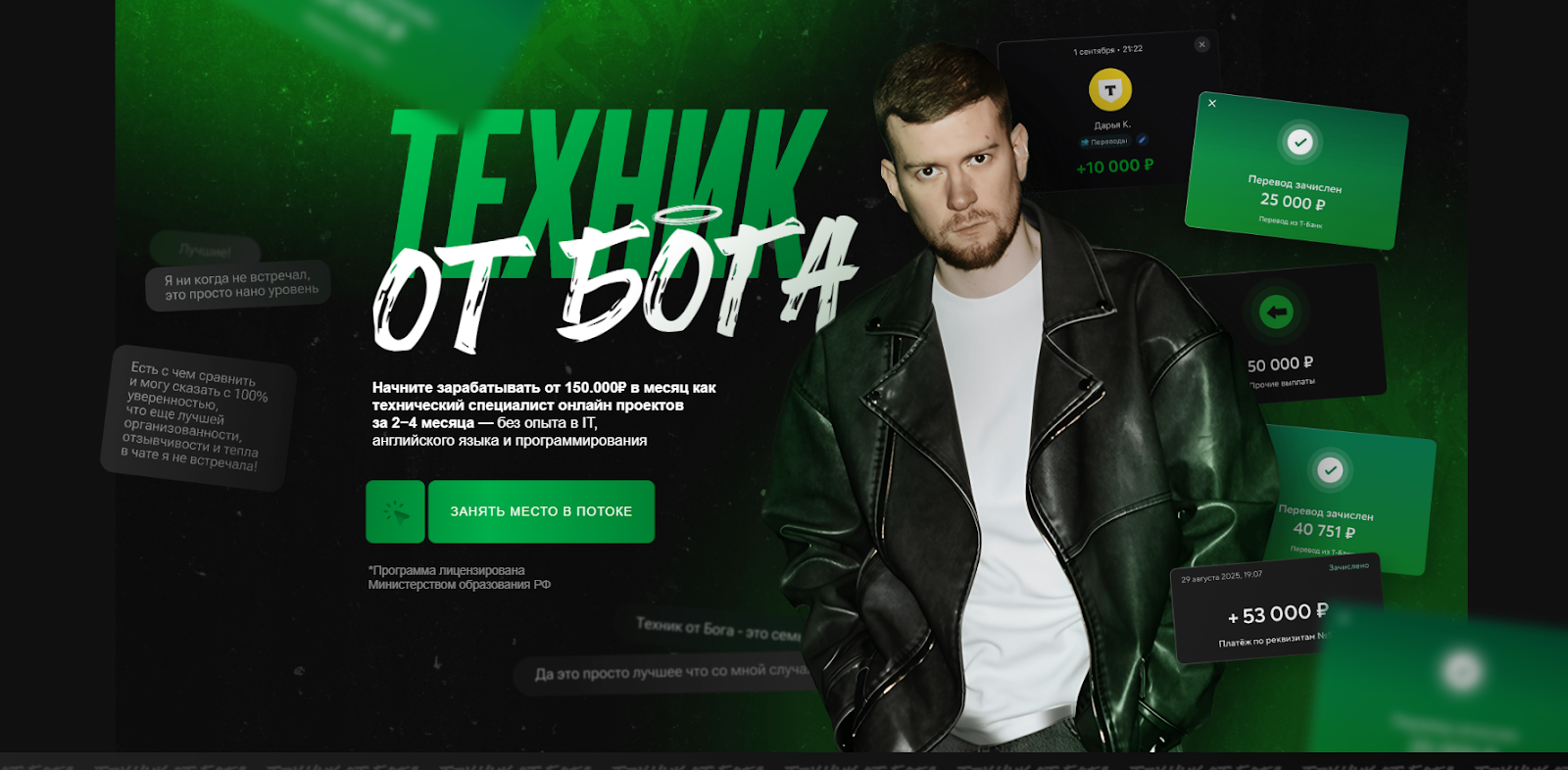 «Техник от Бога» – курс Дмитрия Леншина, в рамках которого он обещает студентам научить их создавать чат-ботов и зарабатывать на техническом обслуживании проектов от ₽150,000 в месяц. По словам автора, клиенту не нужно знать основы программирования или обладать дополнительными навыками – все нюансы входят в программу на 2-4 месяца.