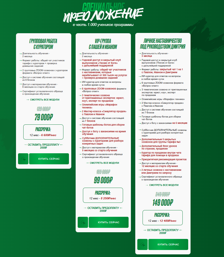 Программа от возможного инфоцыгана Дмитрия Леншина обойдется в сумму от ₽79,000 – это минимальная стоимость доступа к групповой работе с кураторами. Личное наставничество автора оценивается в ₽149,000 – в таком случае курс продлится 3 месяца, а пользователь получит дополнительные материалы.