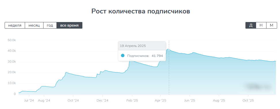 Мы проанализировали статистику и определили, что в рамках блога могла использоваться накрутка – об этом свидетельствует график, на котором заметны значительные скачки. Также отметим, что вовлеченность аудитории в контент проекта составляет всего 5%.