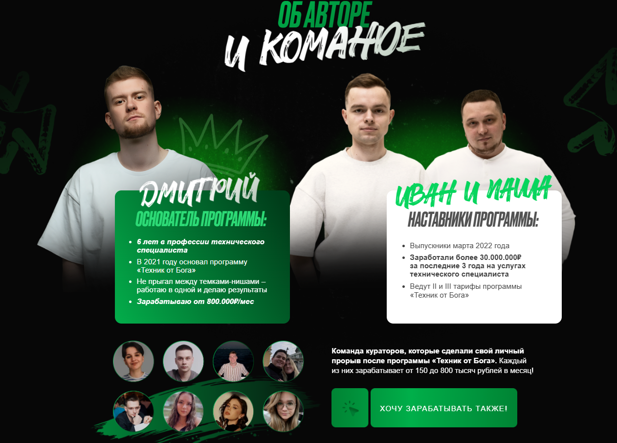 Кроме Дмитрия Леншина, в команду создателей курса также входят наставники Иван и Паша – они якобы закончили обучение в 2022 году и сами уже готовы преподавать.