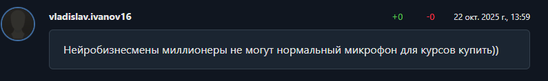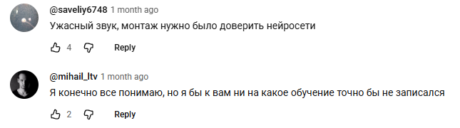 Независимые отзывы о нейросетях Дмитрия Ледовских рисуют совсем другую картину. В комментариях на YouTube люди жалуются на техническое качество контента. Пользователи отмечают плохой звук в роликах. Некоторые пишут, что монтаж стоило бы доверить тем самым нейросетям. Один из комментаторов прямо заявил, что не записался бы на такое обучение.