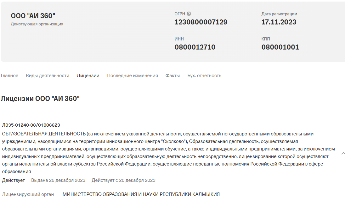 Компания оформлена как ООО «АИ 360». Дата регистрации – 17 ноября 2023 года. Компании нет и двух лет. Учредителями значатся Лапшина Екатерина Викторовна и Ледовских Дмитрий Николаевич. Доли распределены поровну. Выручка за 2024 год составила чуть более 2 млн рублей. Чистая прибыль 469 тысяч рублей. Эти цифры скромные для «масштабного» бизнеса. Зато у организации есть образовательная лицензия.