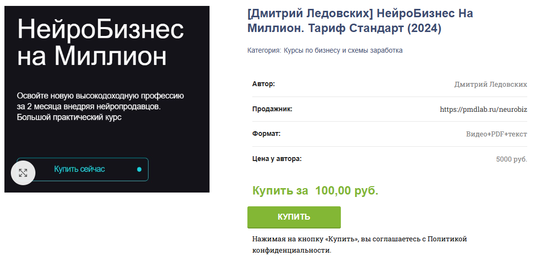Ранее также был курс «Нейродоход» от Дмитрия Ледовских. Но сейчас фокус сместился на новую программу. Старый курс не продается на сайте. Но его можно найти в сети или купить за копейки на форумах. Это дает возможность оценить подачу материала без серьезных трат. Не известно сколько стоит тариф стандарт на курсе «Нейробизнес на миллион» от Дмитрия Ледовских.