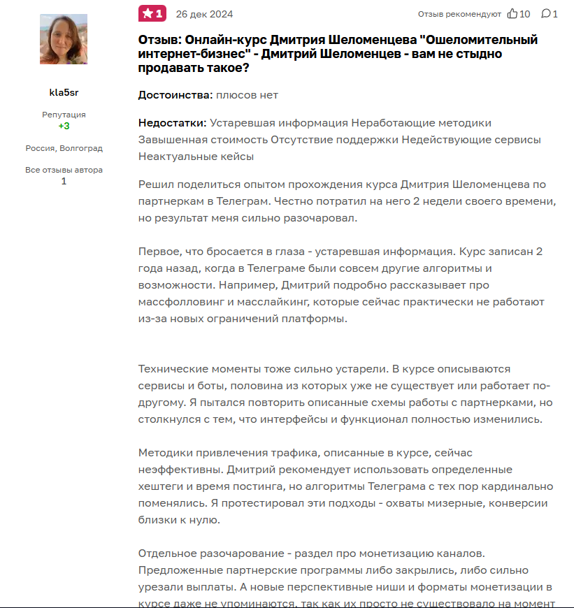 При этом в более свежих отзывах Дмитрий Шеломенцев получил больше критики. Часть студентов жалуется на устаревшие инструкции, неработающие сервисы для телеграмм-каналов, отсутствие свежих кейсов и пассивную обратную связь. Некоторые пишут, что пришлось самостоятельно искать актуальную информацию, потому что материал курса не дал заметного финансового результата. Встречаются претензии к цене и к тому, что реальные примеры доходов слишком устаревшие.