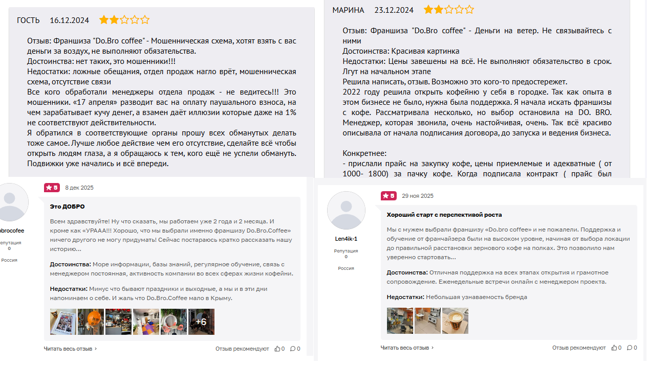Бренд существует достаточно давно и действительно развивается в разных городах, поэтому обещания вряд ли являются ложными. Однако в сети можно встретить противоречивые отзывы о франшизе Do Bro Coffee, что говорит о недовольстве некоторых клиентов.