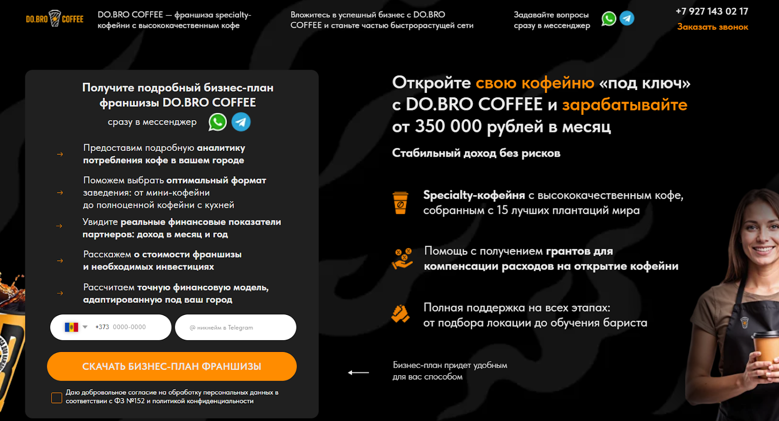 Франшизу Do Bro Coffee продают через сайт dobro-coffe ru, что немного смущает, так как в адресе не хватает некоторых букв, поэтому стоит сохранять осторожность. Этот портал появился в феврале 2025 года, когда сам бренд активно развивается по стране более 10 лет и связан с точками в разных городах.