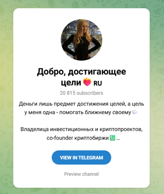 «Добро Достигающее Цели Ru» – телеграм-канал с социальной направленностью. Автором представляется некая Ксения, которая желает приносить пользу человечеству. Но в сообществе освещаются и финансы: инвестиции и криптовалюта. Автор канала поддерживает благотворительные инициативы. В обзоре разберемся со всем внимательно.