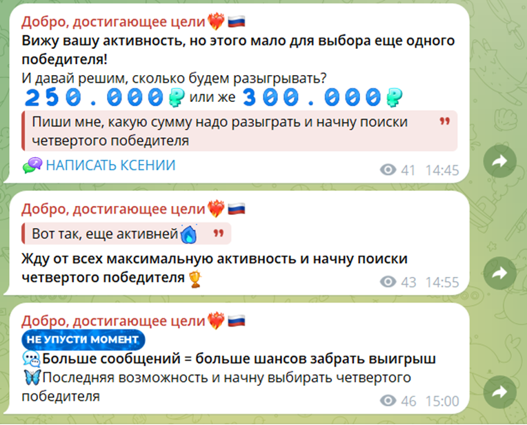 На канале «Добро Достигающее Цели Ru» пользователей просят перевести деньги, чтобы получить выигрыш. Якобы банк не дает возможность отправить крупную сумму, поэтому важно убрать это ограничение. Для этого пользователю нужно сделать перевод. Применяются эмоциональные призывы и срочные ситуации, чтобы человек действовал быстро. Это распространенная схема мошенничества.