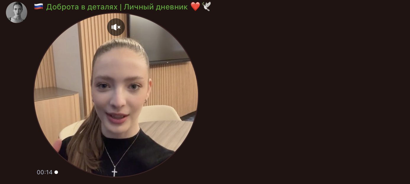 Связь с доверчивой аудиторией Полина поддерживает строго через телеграм канал в формате видео-кружочков. Таким образом она пытается доказать, что является «живым» человеком, и ей можно всецело доверять.