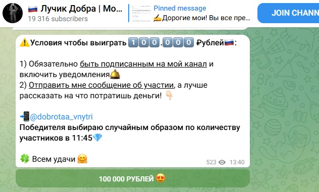 Администратор проекта позиционирует его как возможность для малоимущих получить бонус в виде единоразовой денежной суммы, которая не требует никаких усилий и вложений. Однако выплата будет выполнена не для всех, так как получатель определяется путем розыгрыша. Чтобы стать участником лотереи, необходимо лишь подписаться на канал и написать Анне в личные сообщения.