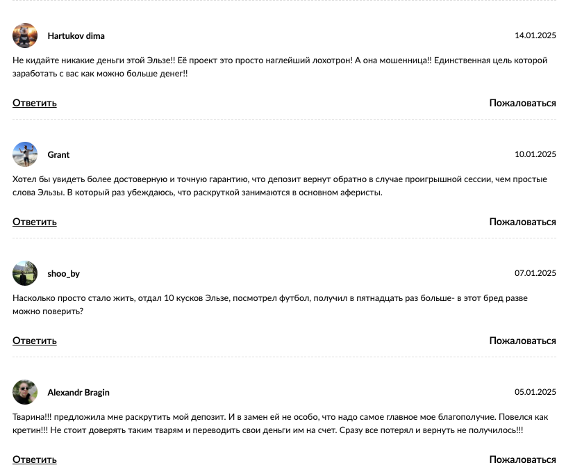 Весь фидбэк на посвященных финансам и инвестициям сайтах об Эльзе является негативным. Те, кто работал с этой трейдершей, писали, что в результате потеряли все переданные ей деньги.