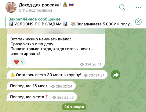 На ТГК «Доход для россиян», располагающийся по адресу arZro9irrQNhMWU1, на 27 января 2026-го года, подписаны 5,12 тыс. юзеров. Публикации на нем собирают в среднем по 250-350 просмотров. Некоторые посты получают по 2-5 реакций, тогда как функция комментирования отключена. Это все явно говорит о том, что аудитория канала накручена при помощи ботов.