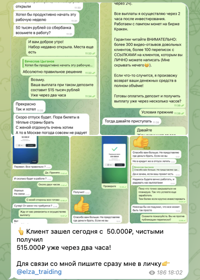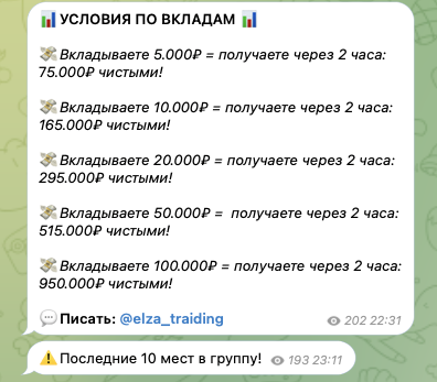 Эльза призывает читателей своего тг-канала переводить ей суммы от 5000 рублей. Она утверждает, что за 2 часа совершит с ними ряд манипуляций, а затем вернет их с огромной прибылью. С целью стимулировать спрос на свои услуги девушка заявляет, что количество мест ограничено.