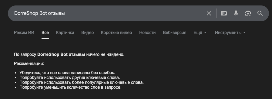 В Сети полностью отсутствуют отзывы о магазине DorreShop Bot. В Google нет ни одного упоминания данного проекта.