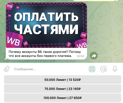 Стоимость предлагаемых аккаунтов, на которых возможно взять рассрочку, составляет примерно 25% от лимита. Например, за учетную запись, с которой можно приобрести товаров на сумму 50 тысяч рублей, через бота продают за 13 520 руб.