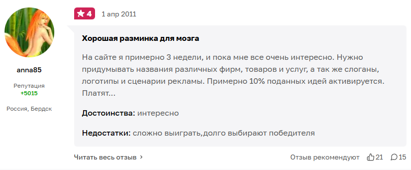 Отдельная группа пользователей указывает на проблемы в условиях. Заказчик и платформа не несут финансовых обязательств перед авторами, тогда как участники тратят значительное время и интеллектуальный ресурс без гарантий оплаты. Также отмечается невозможность объективно проверить, использована ли идея без выплаты за нее.