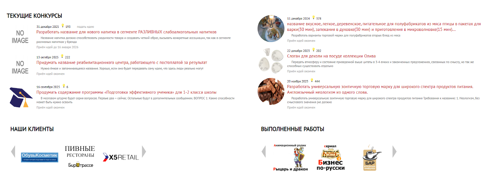 Основной формат работы — конкурсы идей, охватывающие нейминг, слоганы, концепции брендов, рекламные сообщения, тексты, сценарии и образовательные программы. В качестве примеров задач на платформе представлены: