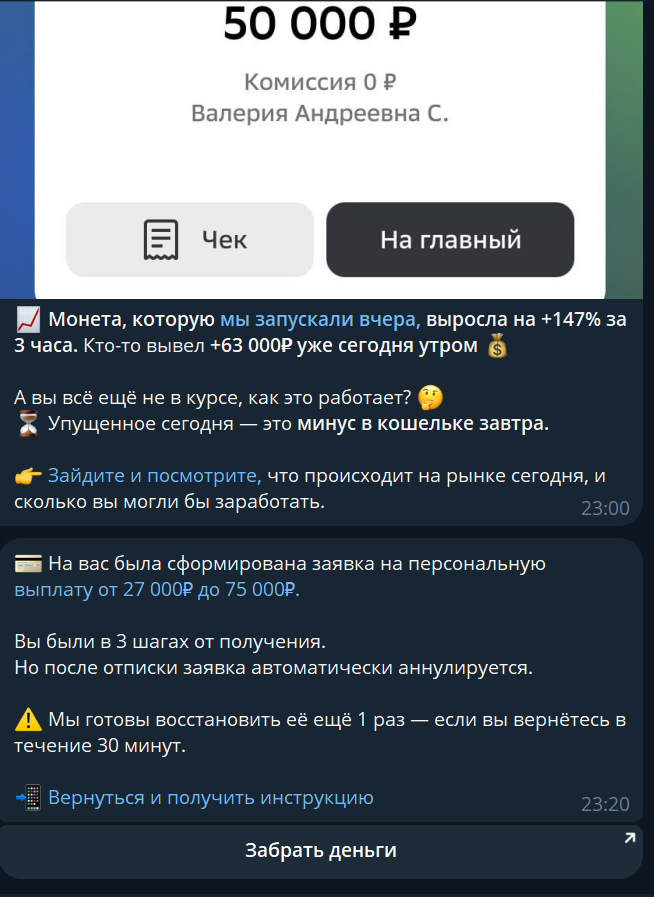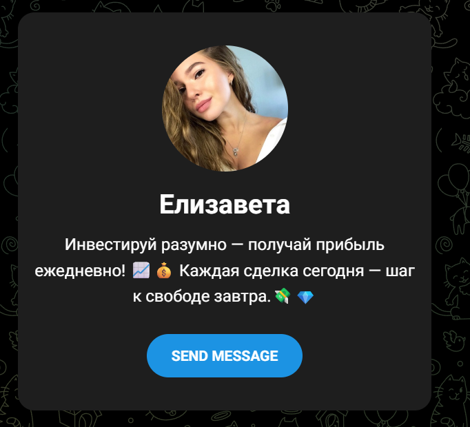 От пользователя требуется только внести деньги. Нужна сумма от 500 рублей и выше. По условиям сотрудничества она может быть преумножена. Получить прибыль можно уже на следующий день. В описании профиля Елизаветы указывается, что каждая сделка приближает человека к финансовой свободе, поэтому не стоит откладывать все на завтра. При этом в боте постоянно высвечиваются различные манипулятивные сообщения, что вам могла прийти выплата, но вы ее проигнорировали и теперь есть всего 1 попытка ее получить. Все ссылки всегда ведут на контакт Елизаветы.